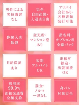 - 年齢が…体型が…お腹に傷が…など不安に思うことはありません。 ありのままで大丈夫です。 当店では容姿や年齢よりも、笑顔、優しさ、気配り、思いやりのある大人の女性を必要としています。 八王子店がオープンしてから1年半。ただ今キャスト様の数が圧倒的に不足しています。 当店の採用率はナント90%以上!!! 大切なのは頑張りと、お客様への気遣い・心配りだけ! 即採用・体験入店も出来ます! 短期間の在籍も大歓迎でございます♪ 貴女が働きやすい・居心地の良いお店作りを常に考えておりますので、スタッフ全員、貴女を完全サポート致します! 面接のみでも構いません。お話を聞いて納得して、まずは1日体験からどうぞ。 ※バック率約70%!30~60代女性が忙しいお店です♪ ※全体の80%以上のお客様が90分コース以上なので、一日3万円以上の女性が多数! ※100%全額日払い ※ノルマや罰金一切ありません ※完全自由出勤 ※全室個室待機 ※ラブホテル・ビジネスホテルのみでのお仕事も可能です※自宅出張のお仕事は大丈夫な女性のみご案内しております ※ハードなサービス(即尺や即プレイ・イマラチオなど)は一切ありません! ※過激なサービスをする必要も一切ございません! ※携帯電話が無くても働けます♪無料で携帯電話を貸し出ししてます。 ※Wi-Fiも完備! 届出済みの法人経営優良風俗店ですので安心してお勤めして頂けます。 もちろん、ご質問やお問い合わせだけのご連絡も歓迎です。 沢山質問して頂き、納得してからまずは体験入店でお試しください。 大手ならではの安心感と実績! 圧倒的な顧客数で99%満足できる収入を確保! お客様にGoogle・Yahooなどで熟女デリヘルなどで キーワード検索すると常に上位表示されるお店で