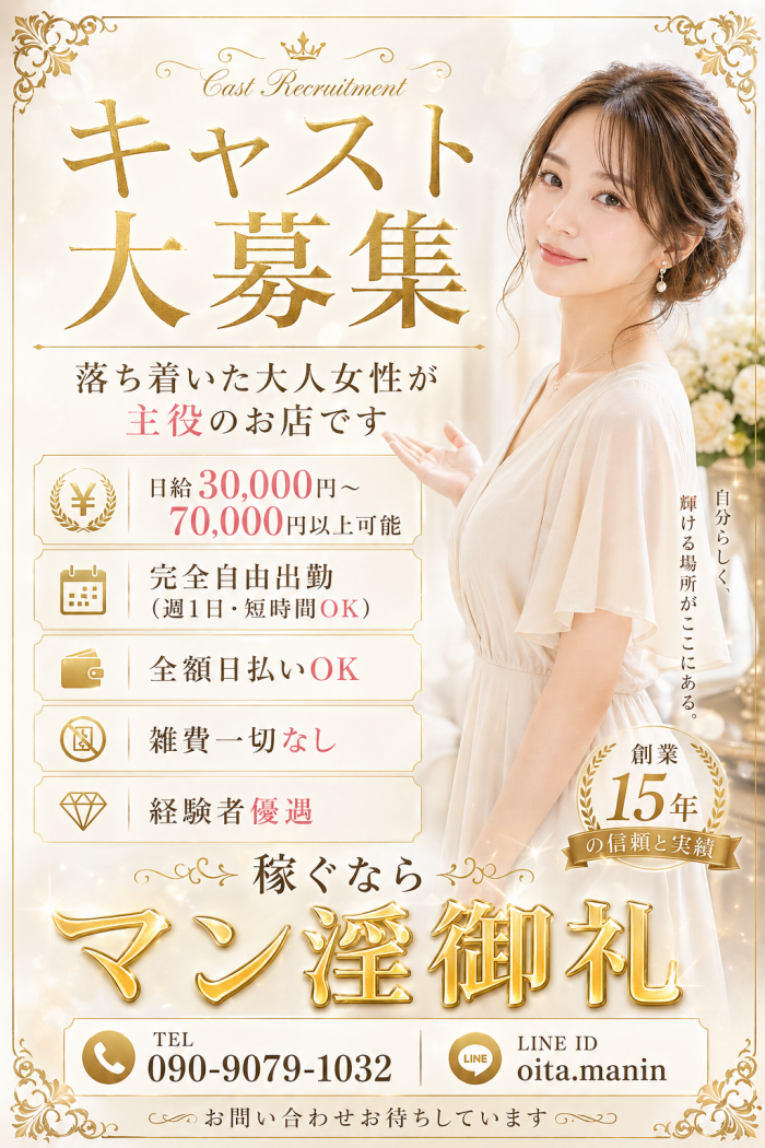 - 当店は28歳から~35歳までの女性を募集してります。 容姿や体形など自身がない方も心配いりません。 お仕事内容は、『お客様の癒しのお仕事』に なりますのでご自身の『一生懸命な姿勢』があれば 問題ありません。 ▼給与 高収入はみんなの願い!納得の給与システムで高額収入! 貴方のやる気・前向きさ・誠実さで どんどんお給料に繋がります♪ ※当店独自の昇給制度あり ※(例)80分手取り…8,000円+α~12,000円+α ▼時間 9時からラストまでの時間内で完全自由出勤制度です。 1日体験、短期、長期、土日だけ、遅い時間だけでも大丈夫です! ▼求人キャンペーン開催中 ↓↓↓↓↓↓↓↓ ~チェリッシュグループ合同~ 今だけ!求人2大特典!! ☆特典1☆ 入店祝い金10万円 ☆特典2☆ 面接交通費5000円 ▼待遇 完全日払い 自由出勤 寮完備 自走OK(交通費支給) 自宅待機OK 駐車場完備 託児所補助あり 制服貸与(もちろん私服OKです) アリバイ対策万全 他店とも掛け持ちOK セクハラ講習なし 派閥などなくアットホームなお店です。 ノルマ・セクハラ・いじめ一切心配いりません。 ☆大分県最大級の人妻店☆ だ・か・ら『集客率』・『知名度』・『高収入』