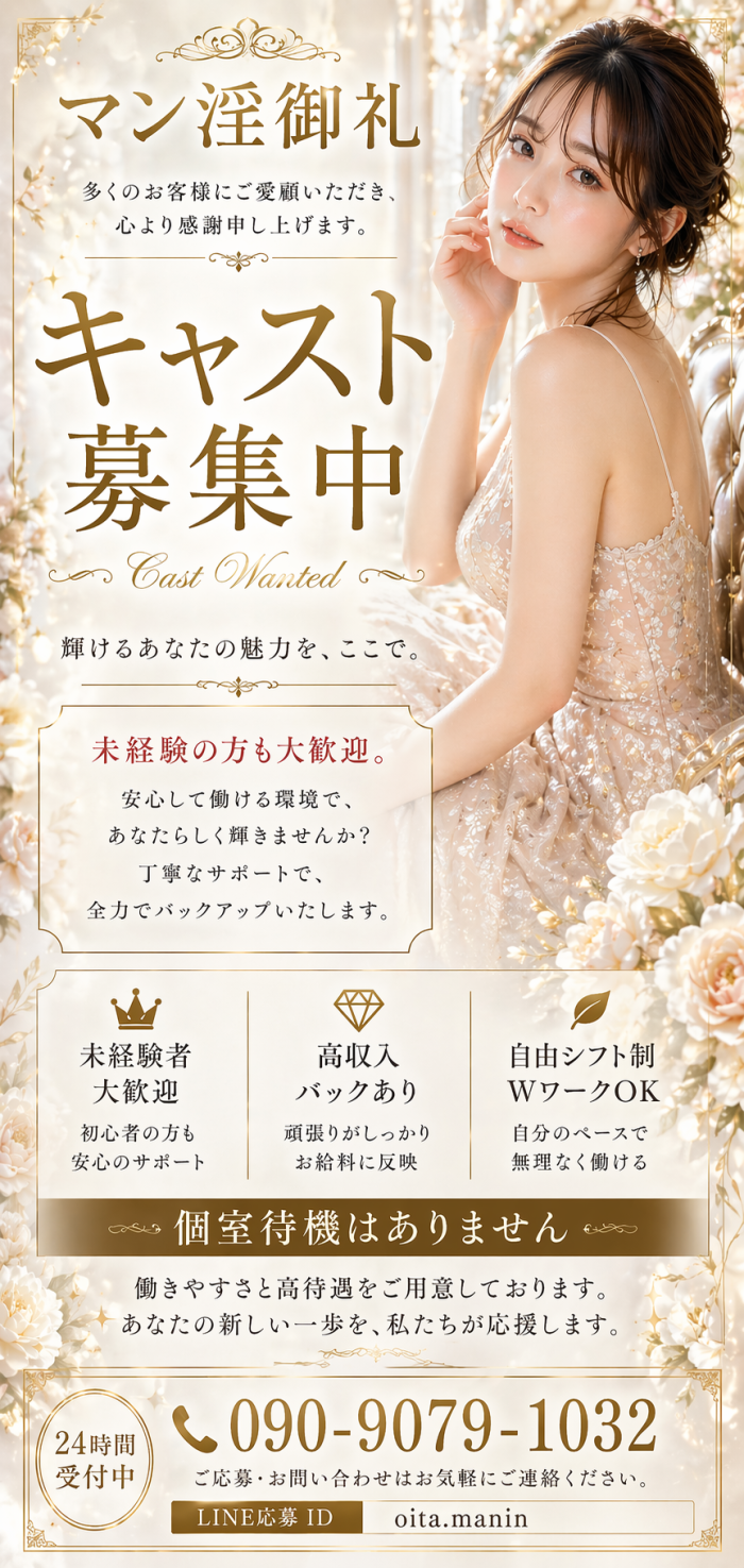 - 当店は28歳から~35歳までの女性を募集してります。 容姿や体形など自身がない方も心配いりません。 お仕事内容は、『お客様の癒しのお仕事』に なりますのでご自身の『一生懸命な姿勢』があれば 問題ありません。 ▼給与 高収入はみんなの願い!納得の給与システムで高額収入! 貴方のやる気・前向きさ・誠実さで どんどんお給料に繋がります♪ ※当店独自の昇給制度あり ※(例)80分手取り…8,000円+α~12,000円+α ▼時間 9時からラストまでの時間内で完全自由出勤制度です。 1日体験、短期、長期、土日だけ、遅い時間だけでも大丈夫です! ▼求人キャンペーン開催中 ↓↓↓↓↓↓↓↓ ~チェリッシュグループ合同~ 今だけ!求人2大特典!! ☆特典1☆ 入店祝い金10万円 ☆特典2☆ 面接交通費5000円 ▼待遇 完全日払い 自由出勤 寮完備 自走OK(交通費支給) 自宅待機OK 駐車場完備 託児所補助あり 制服貸与(もちろん私服OKです) アリバイ対策万全 他店とも掛け持ちOK セクハラ講習なし 派閥などなくアットホームなお店です。 ノルマ・セクハラ・いじめ一切心配いりません。 ☆大分県最大級の人妻店☆ だ・か・ら『集客率』・『知名度』・『高収入』