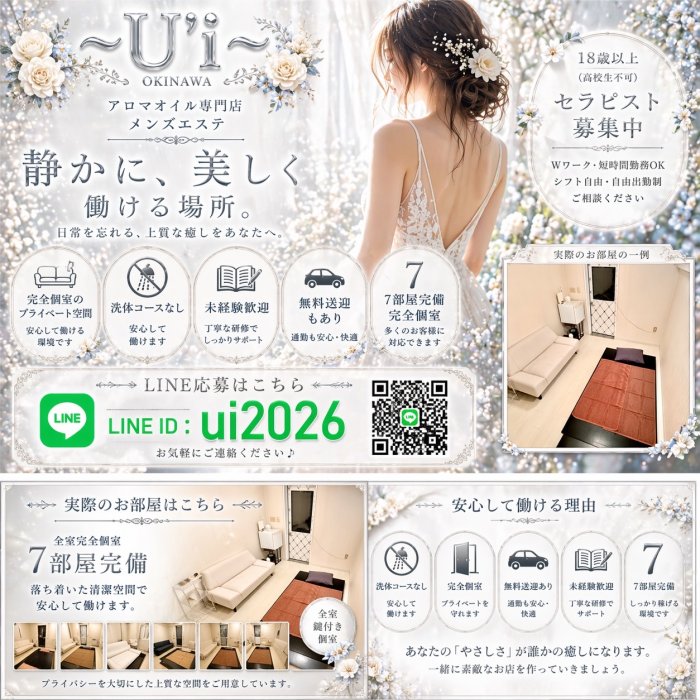 - ■沖縄初!?『完全』個室待機!!今までのお店で派閥・イジメなどで嫌な思いをした事はありませんか?当店では、「個室待機ができる」ではなく「完全個室待機」の県内唯一のお店です。一人一人にお部屋を用意しておりますので、プライバシーも守られ・貴重品の管理などに気を遣う必要もありません。出勤から帰るまで、誰にも会わず周りを気にせず自分のペースでお仕事が出来ます。もちろん各個室には、TVや冷蔵庫・無料Wi-Fiなども完備!各個室はスタッフが定期的に清掃しておりますので、気持ちよく使って頂けます。又、キャストさんが自由に使えるコミュニケーションルームも用意しております。■ノルマ・罰金などは一切ありません!■沖縄全域無料送迎致します!■当店専用の無料駐車場がご用意してあります。駐車場はお店から少し離れた所にあるので、知人バレの心配もありません。少しでも快適・安心にお仕事がして頂ける様に、スタッフ一同サポートさせて頂きますので、24時間いつでもお気軽にお問合せ下さい。
