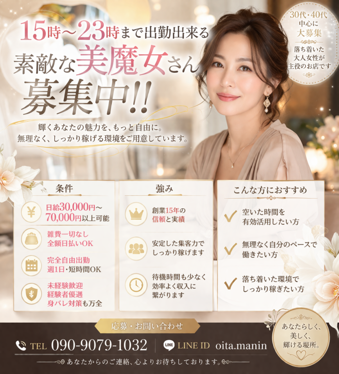- 当店は28歳から~35歳までの女性を募集してります。 容姿や体形など自身がない方も心配いりません。 お仕事内容は、『お客様の癒しのお仕事』に なりますのでご自身の『一生懸命な姿勢』があれば 問題ありません。 ▼給与 高収入はみんなの願い!納得の給与システムで高額収入! 貴方のやる気・前向きさ・誠実さで どんどんお給料に繋がります♪ ※当店独自の昇給制度あり ※(例)80分手取り…8,000円+α~12,000円+α ▼時間 9時からラストまでの時間内で完全自由出勤制度です。 1日体験、短期、長期、土日だけ、遅い時間だけでも大丈夫です! ▼求人キャンペーン開催中 ↓↓↓↓↓↓↓↓ ~チェリッシュグループ合同~ 今だけ!求人2大特典!! ☆特典1☆ 入店祝い金10万円 ☆特典2☆ 面接交通費5000円 ▼待遇 完全日払い 自由出勤 寮完備 自走OK(交通費支給) 自宅待機OK 駐車場完備 託児所補助あり 制服貸与(もちろん私服OKです) アリバイ対策万全 他店とも掛け持ちOK セクハラ講習なし 派閥などなくアットホームなお店です。 ノルマ・セクハラ・いじめ一切心配いりません。 ☆大分県最大級の人妻店☆ だ・か・ら『集客率』・『知名度』・『高収入』