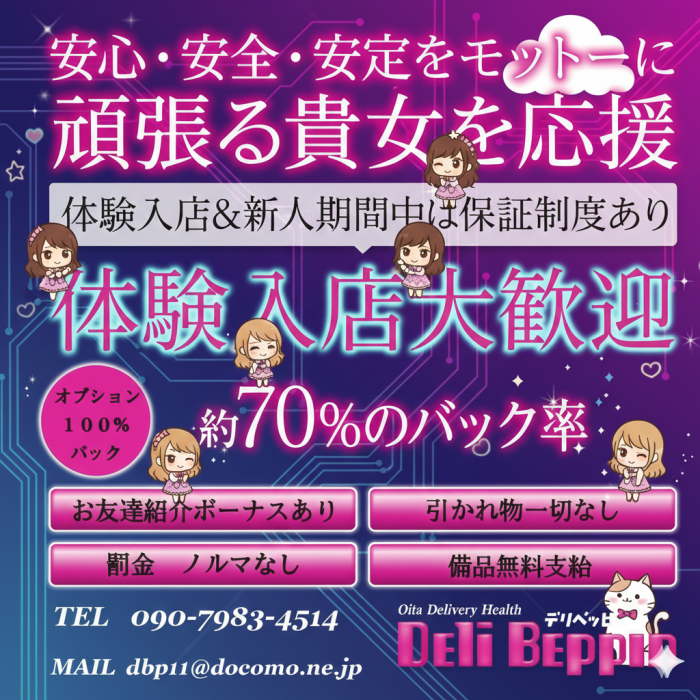 - ╔═════════════════════╗ 🎀ただ今、激アツに稼げます🎀 ╚═════════════════════╝ POINT、① 🔶入店祝金3万円プレゼント! 入店特典として新人さん全員にプレゼントしております♪厳しい条件なくどなたにも適用! POINT、② 🔶入店5日間は100%バック! 求人キャンペーン実施中!お客様からいただく金額がすべて女性のお給料となるスペシャルチャンス! POINT、③ 🔶引かれモノはありません! お店が割引きキャンペーン等を行った場合でも女性のお給料は減りません♬ (割引き分は全てお店負担しています) 雑費などといった名目の引かれモノは一切ありません。